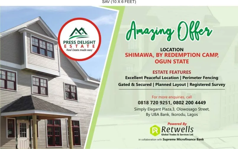 Press Delight Estate powered by Retwell Global Trades and Services Limited is situated at Shimawa, Ogun State, Nigeria. It is ten (10) minute drive from the main express and two (2) minute drive to Adron Homes and surrounded by other developing estates. It has a link road to Shagamu Town.